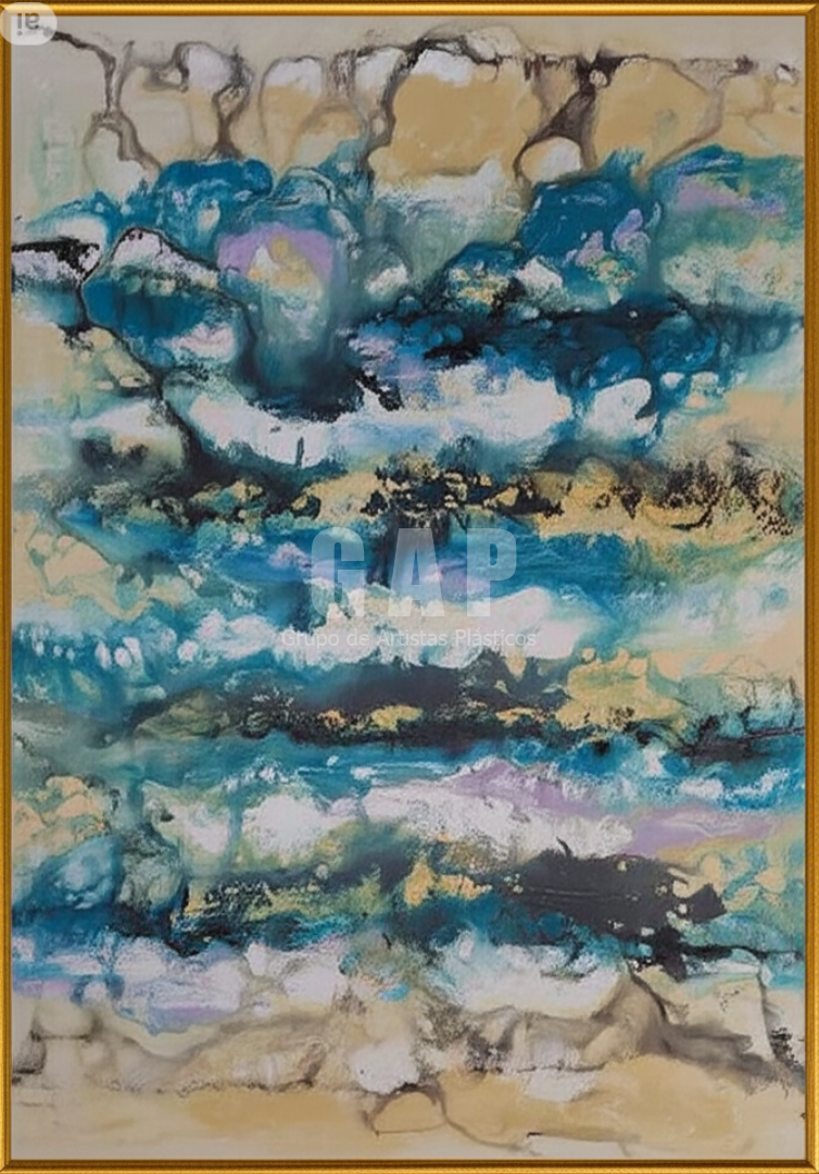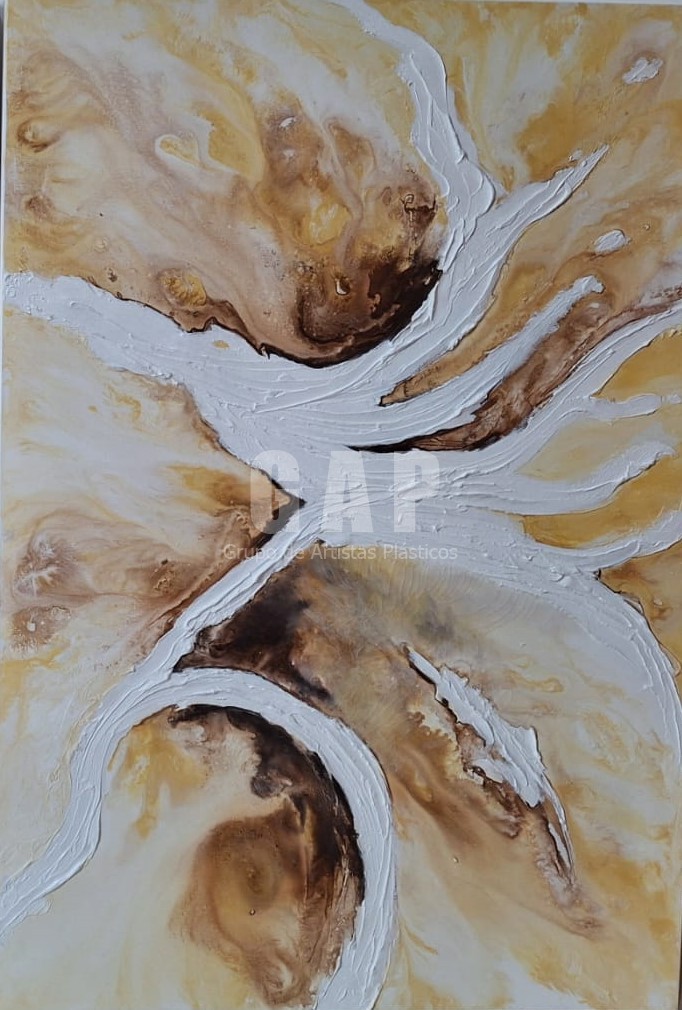 É professora de Arte do Ensino Médio e paralelamente produz seus trabalhos em tinta acrílica sobre tela, texturas e experimentações.